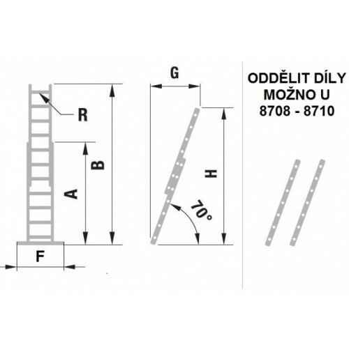 Dvojdielny výsuvný rebrík Forte, počet priečok 2 x 14, max. výsuvná dĺžka 7,22 m a šírka 484 mm. Rebrík možno rozobrať a použiť ako dva jednoduché rebríky s dĺžkou 4,11 m