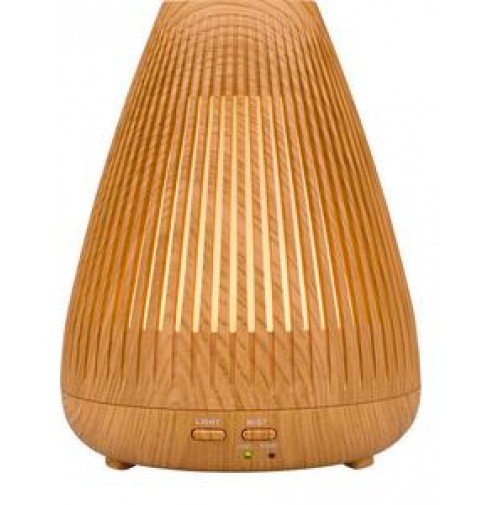 Zvlhčovač vzduchu s difuzérom v dizajne prírodného dreva (imitácia dreva). Aromatizuje a zvlhčuje vzduch kombináciou účinkov vodnej hmly a esenciálnych olejov. Pomocou jemného ultrasonického vlnenia rozkladá esenciálne oleje na extrémne malé mikročastice, bez toho aby ich zahrieval. Oleje si tak zachovávajú pôvodnú vôňu aj liečivé účinky. Aróma difuzér vám pomôže vytvoriť z každej izby voňajúce oázu a navodiť relaxačnú atmosféru. Bez pridania esenciálneho oleja vám aróma difuzér poslúži ako zvlhčovač vzduchu. Pridaním konkrétneho esenciálneho oleja môžete sebe, alebo vašim blízkym pomôcť s rôznymi ťažkosťami. Postačí pár kvapiek kvalitného oleja a môžete uľaviť nádche, kašľu, bolestiam hlavy, alebo zlému zaspávanie. Správne zvolený olej vyčistí vzduch, alebo vám jednoducho spríjemní pobyt v miestnosti, v ktorej sa práve nachádzate. Vďaka neutrálnemu dizajnu svetlého prírodného dreva štýlovo doplní vybavenie všetkých obytných priestorov, detských izieb, rokovacích miestností, masážnych salónov, wellness centier apod. Vhodne zvolenými esenciálnymi olejmi môžete podporiť relaxačnú atmosféru v spálni, dezinfekciu vzduchu či pokojný spánok v detskej izbe. Koncentráciu v izbe študenta alebo uvoľnenú komunikáciu, či už doma alebo v pracovnom prostredí. Používajte vždy kvalitné oleje. Použitím lacných, umelých olejov síce vytvoríte voňavé prostredie, ale telo a myseľ si neodpočinú. Citlivým osobám môže naopak uškodiť. Napríklad bolestí hlavy a pod. Počas prevádzky aróma difuzéra možno ľubovoľne a jednoducho nastaviť svetelné efekty, ktoré vytvoria vo vašej izbe veľmi príjemné prostredie a navodí relaxačnú atmosféru. Aróma difuzér je vhodný všade, kde je z bezpečnostných dôvodov nemožné použiť otvorený oheň (sviečky v aróma lampách). Kombinuje účinky vodnej hmly a esenciálnych olejov. Obsluha aróma difuzéra je veľmi jednoduchá. Do zásobníka nalejete vodu, najlepšie destilovanú. Nakvapkať niekoľko kvapiek esenciálneho oleja a prístroj zapnete stlačením tlačidla MIST (hmla). Aróma difuzér začne okamžite vytvárať vodnú hmlu a rozptyľovať olej do vzduchu. Druhým stlačením nastavíte prerušovanou tvorbu hmly a tretím ho vypnete. Pomocou tlačidla LIGHT môžete nastaviť režim farebného podsvietenia. Prvým stlačením nastavíte režim pozvoľného rozsvietenie a zhasínanie svetla. Druhým stlačením zastavíte intenzitu svetla na aktuálnej úrovni a tretím stlačením svetlo vypnete. Nemusíte kontrolovať množstvo vody v zásobníku. Po vyprázdnení sa aróma difuzér sám vypne.