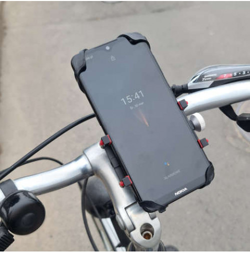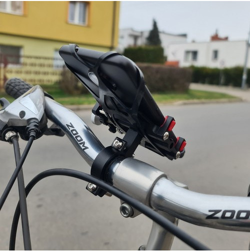 Držiak na riadidlá bicykla vám umožní voľne používať váš chytrý telefón počas výletu a počas tréningu. Je určený pre montáž telefónov, navigačných systémov alebo MP3 prehrávačov so šírkou od 54 do 100 mm. Držiak je vyrobený z hliníka a montuje sa na riadidlá s priemermi 22,2 - 31,8 mm. Navyše má nastaviteľné rameno a otočnú rukoväť, ktorá umožňuje lepšie uchytenie na bicykel. Držiak podopiera telefón zospodu aj zo strán, pričom gumička celý telefón stabilizuje.